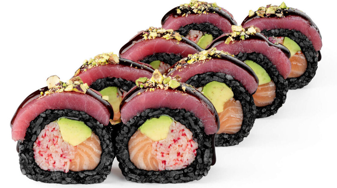 рис з чорнилами каракатиці, крабовий заміс, лосось, авокадо, тунець, соус унагі, фісташки