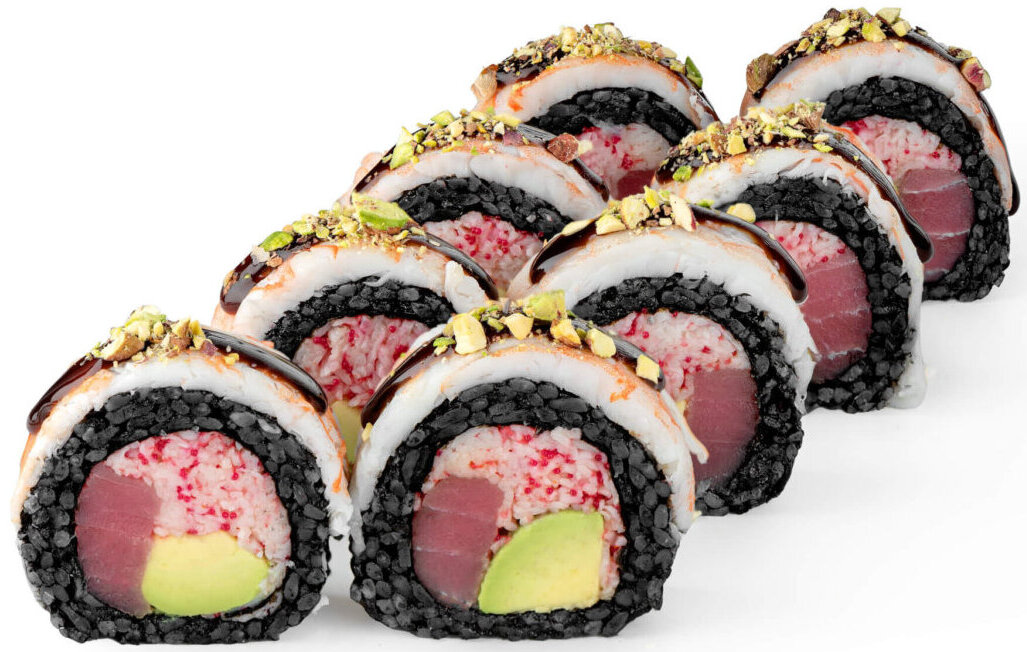 рис з чорнилами каракатиці, крабовий заміс, тунець, авокадо, креветка, соус унагі, фісташки
